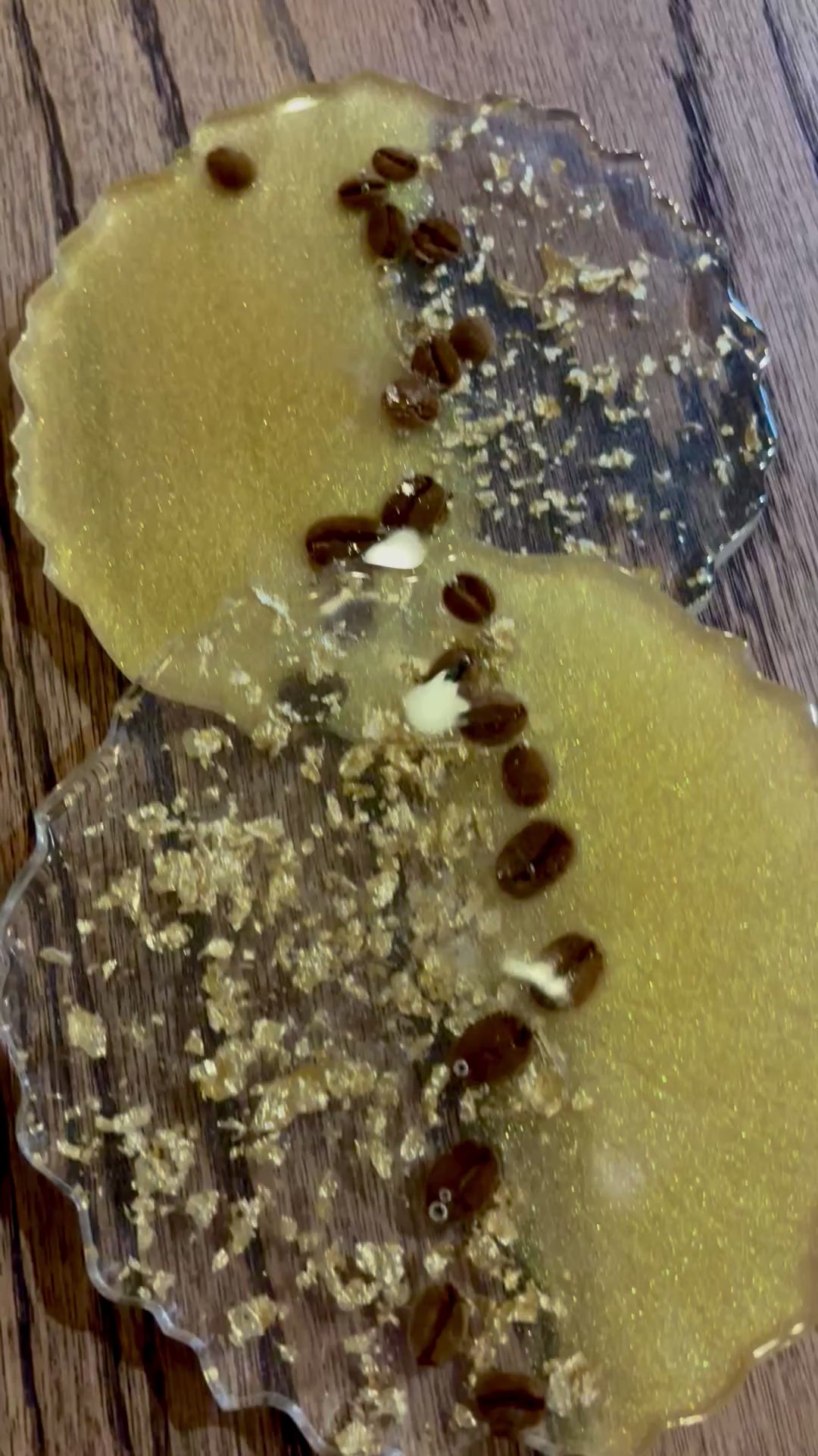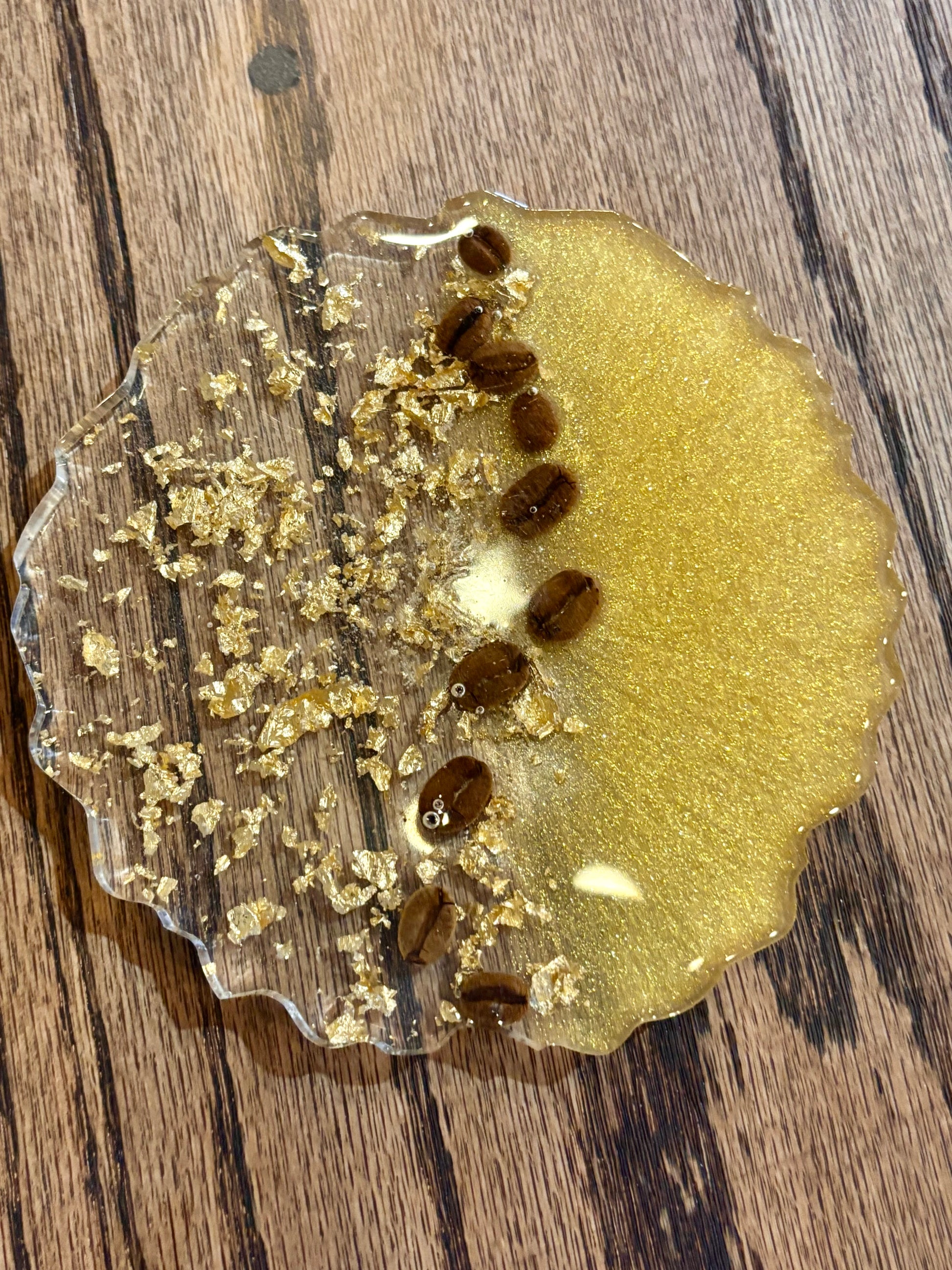 Handmade resin coaster. Hand pored with one side being teal & the other clear with gold flakes- in the middle, real Guatemalan coffee beans.