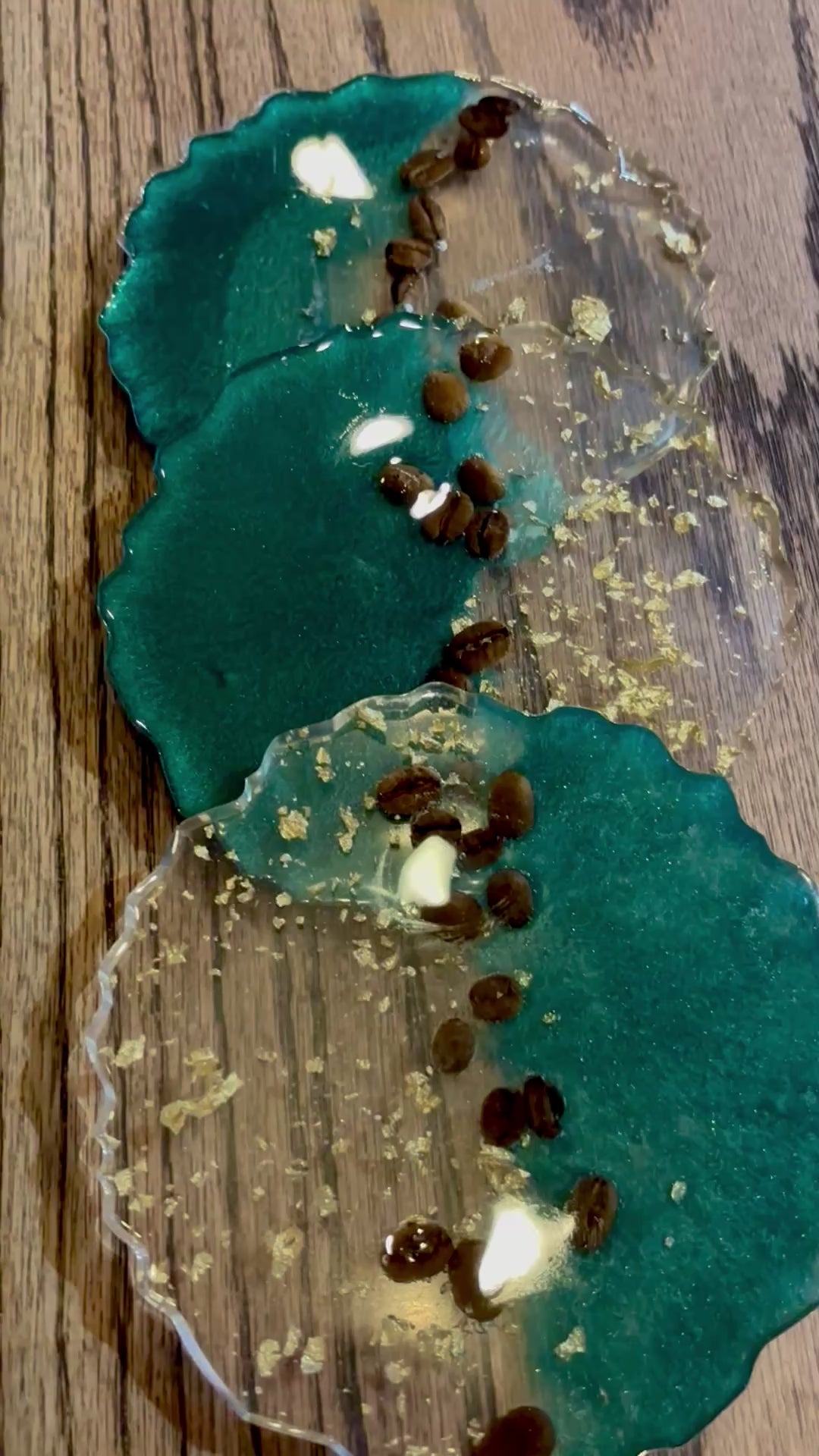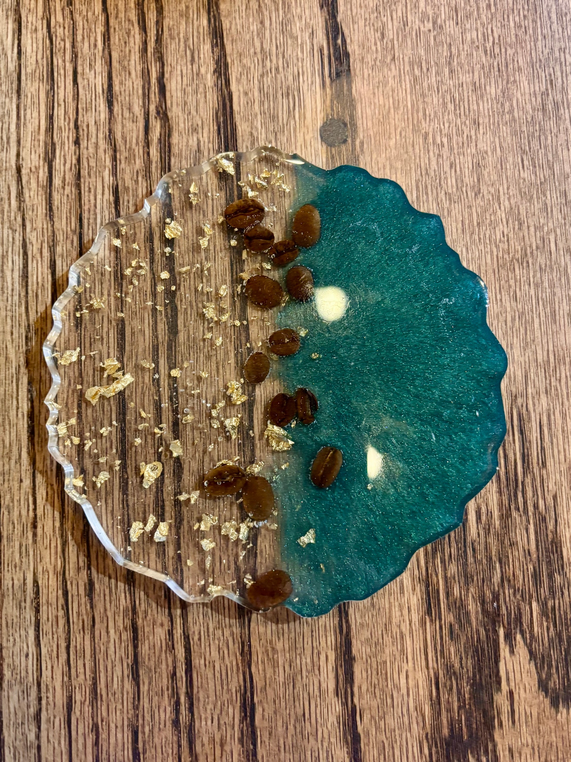 Handmade resin coaster. Hand pored with one side being teal & the other clear with gold flakes- in the middle, real Guatemalan coffee beans.