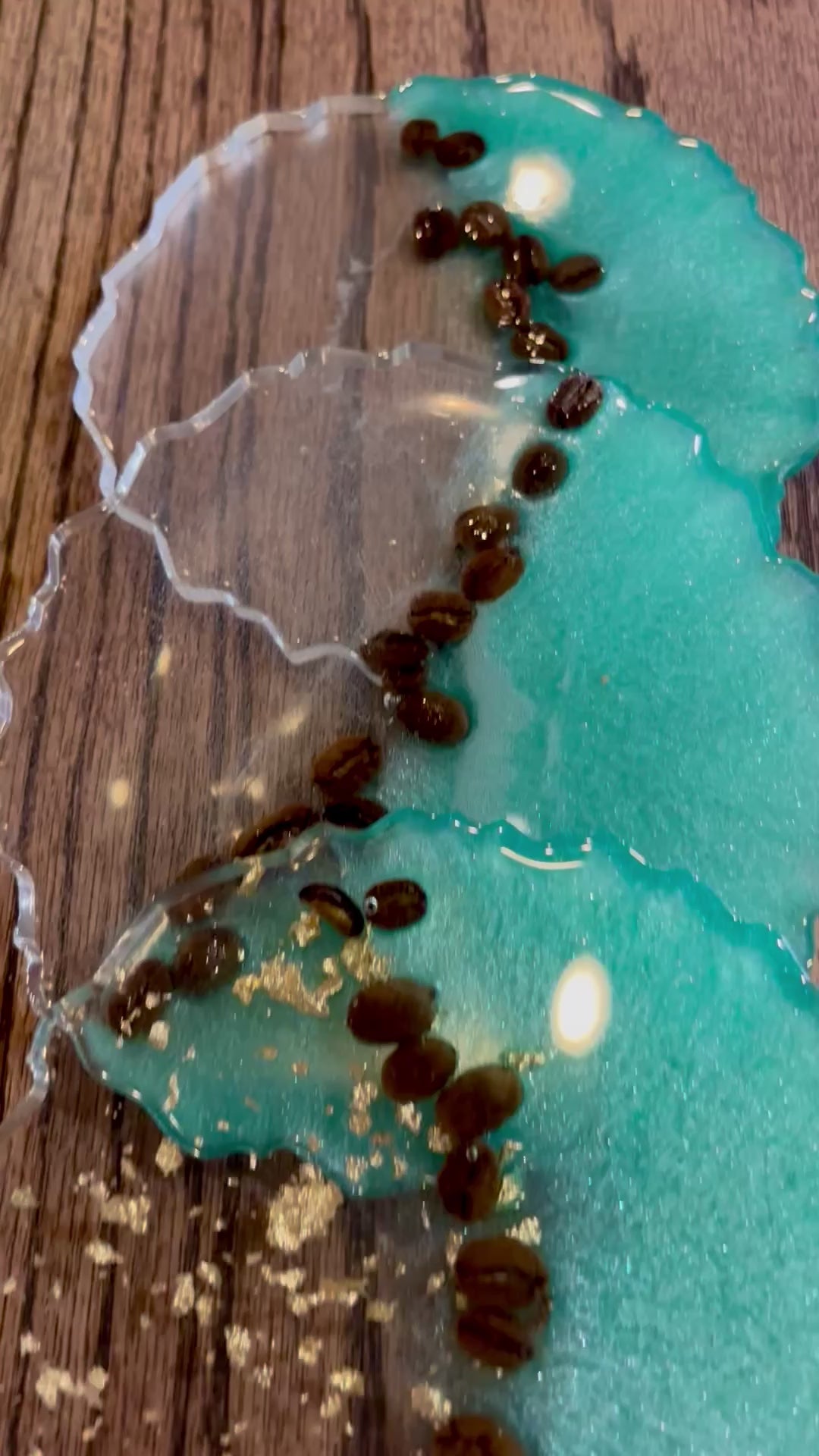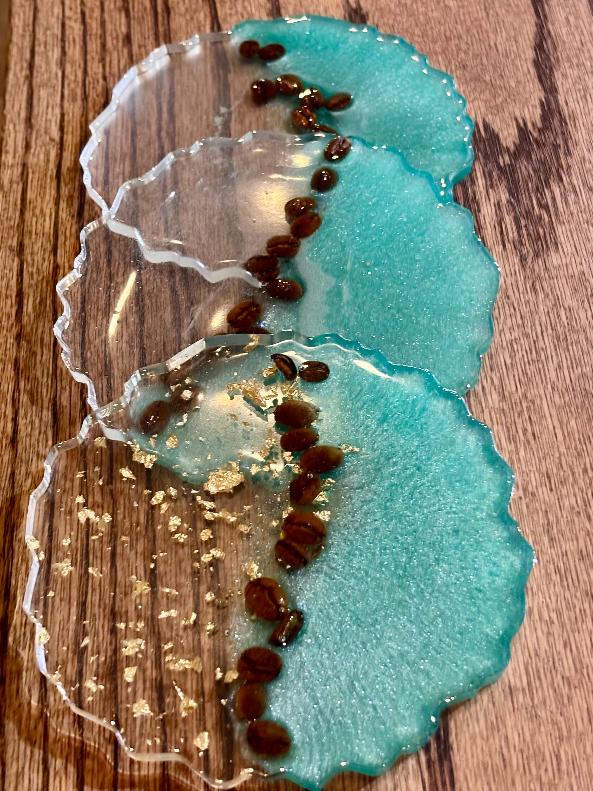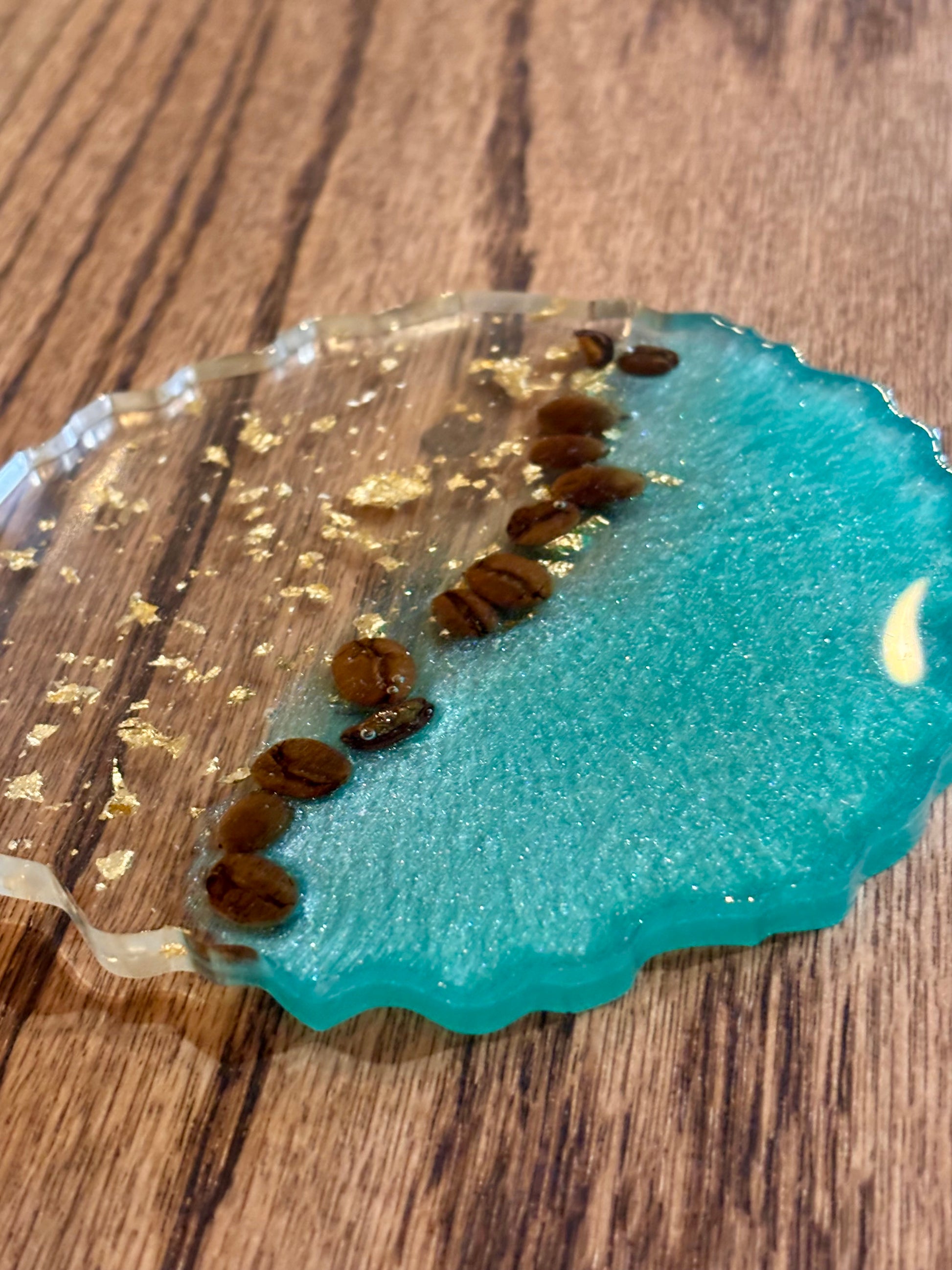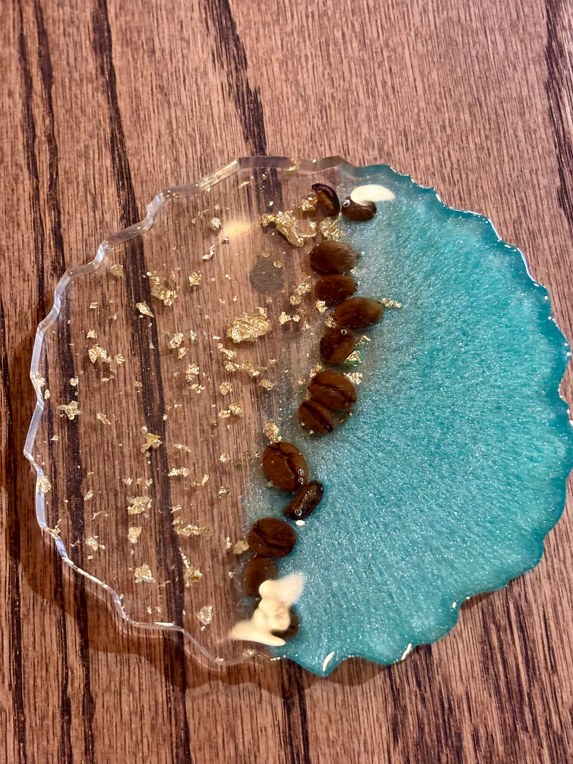 Handmade resin coaster. Hand pored with one side being teal & the other clear with gold flakes- in the middle, real Guatemalan coffee beans.